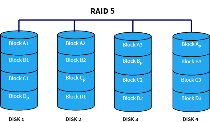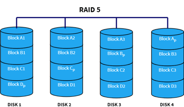 RAID 5 – paridad distribuida que permite tolerar la falla de un disco