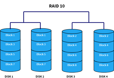 RAID 10 – combinación de espejo y distribución de datos que ofrece alto rendimiento y redundancia